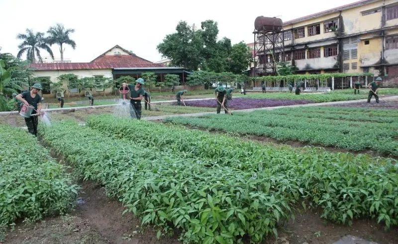 Chiến sĩ trẻ hăng hái tưới rau trong giờ tăng gia sản xuất