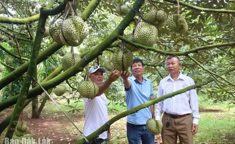 | Ông Nguyễn Đắc Tiến, Chủ tịch Hội đồng quản trị Hợp tác xã Sản xuất Nông nghiệp – Dịch vụ Cư Kuin (bìa phải) kiểm tra vườn sầu riêng của các thành viên trong hợp tác xã. |