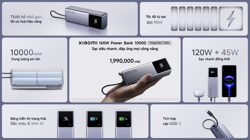 – Xiaomi 165W Power Bank 10000 giá 1.990.000 đồng. Từ ngày 1 – 31/1/2025, giảm 300.000 đồng, còn 1.690.000 đồng.